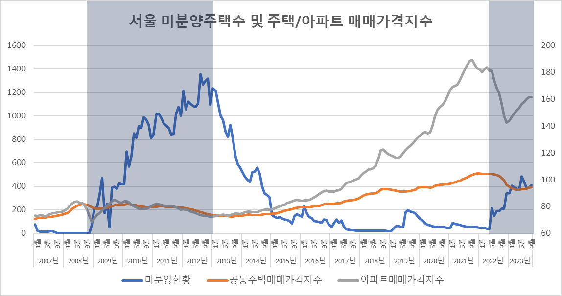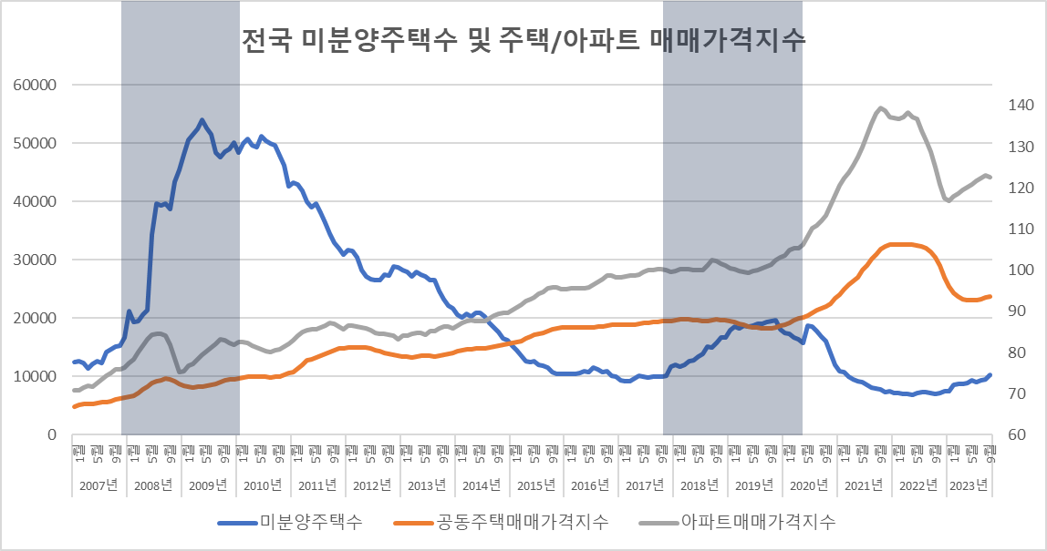- 출처 정보 : 국토교통부 통계누리(미분양주택수), 부동산정보원 (공주택 / 아파트 매매가격지수)
