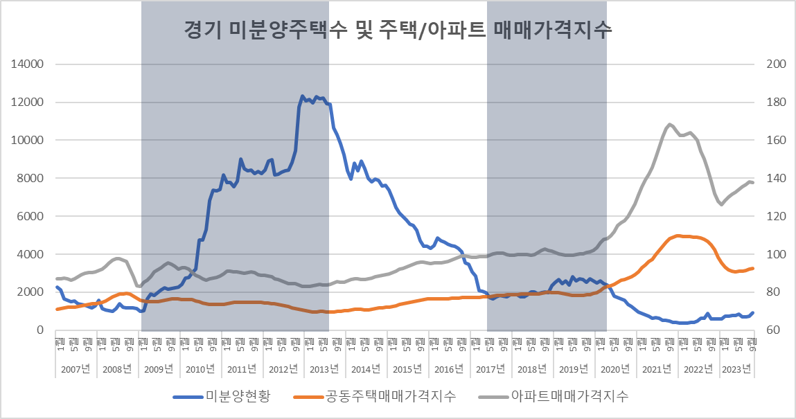 경기도 미분양주택수 및 공동주택/아파트 매매가격지수
