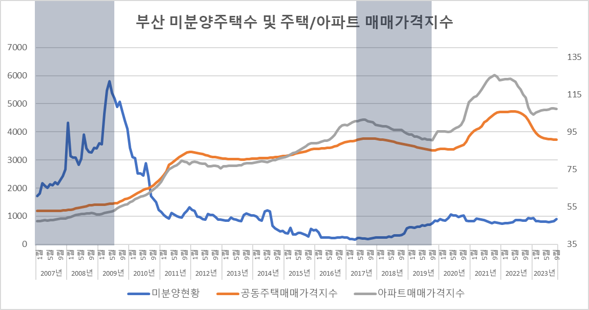 부산 미분양주택수 및 공동주택/아파트 매매가격지수 변화