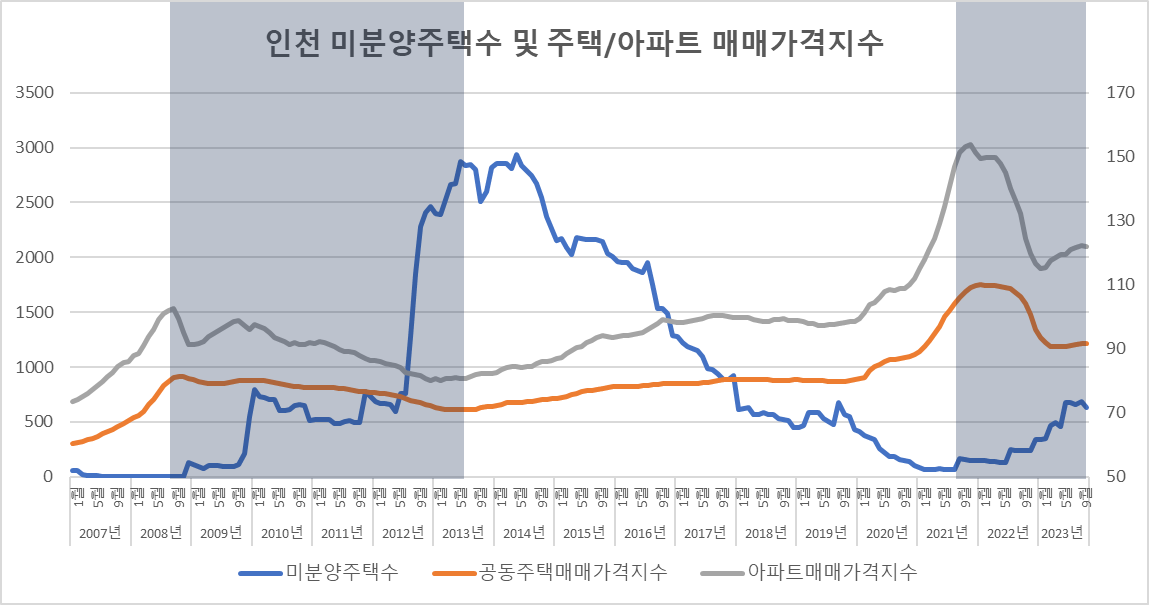 인천 미분양주택수 및 공동주택/아파트 매매가격지수 변화
